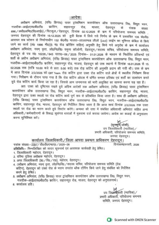 जनपद देहरादून ने 19.12.2025 को आयोजित बैठक में लिए गए निर्णय के क्रम में अधीक्षण अभियंता, नवम वृत्त, लोक निर्माण विभाग, यमुना कॉलोनी, देहरादून / सदस्य सचिव, परियोजना समन्वय समिति द्वारा पत्र 01.01.2026 के माध्यम से निर्धारित शर्तों एवं प्रतिबंधों के अधीन 16.01.2026 से 15.02.2026 तक, रात्रि 10 बजे से प्रातः 5 बजे तक रोड कटिंग की सशर्त अनुमति प्रदान की गई थी।