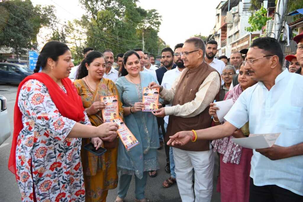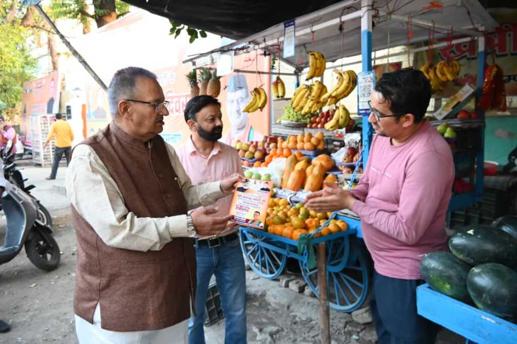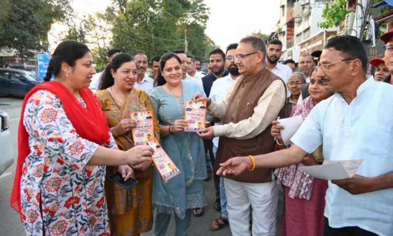 प्रधानमंत्री नरेन्द्र मोदी के उत्तराखण्ड आगमन पर हाथीबड़कला बाजार में जनसंपर्क कर निमंत्रण देते कृषि मंत्री गणेश जोशी