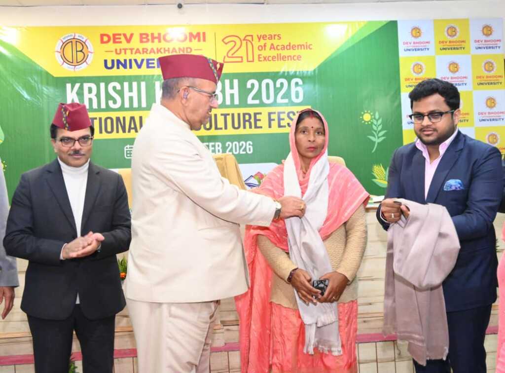 देवभूमि उत्तराखण्ड विश्वविद्यालय द्वारा आयोजित कृषि कुम्भ में प्रगतिशील किसानों को सम्मानित करते कृषि मंत्री गणेश जोशी