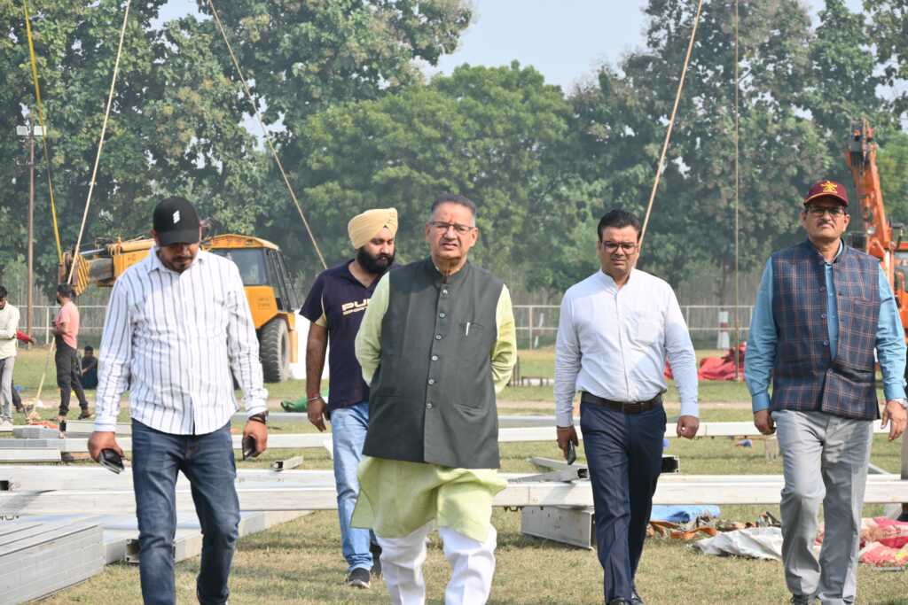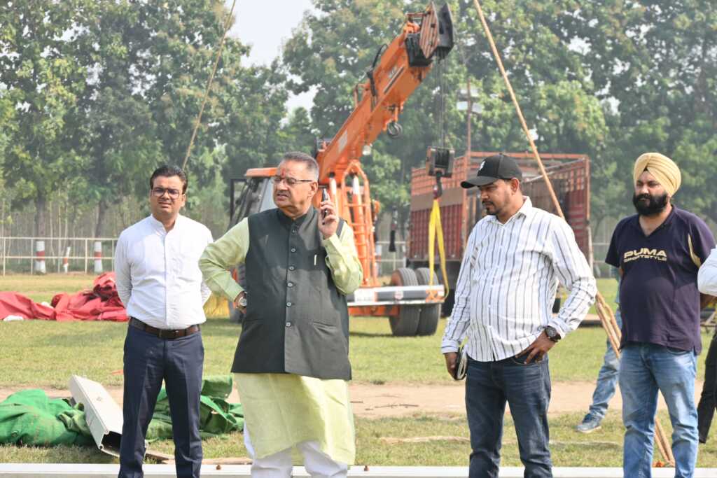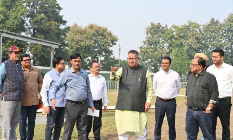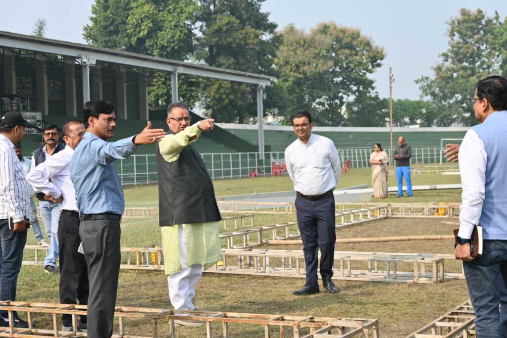 मंत्री जोशी ने अधिकारियों के साथ पंतनगर विश्वविद्यालय स्टेडियम का स्थलीय निरीक्षण के दौरान कार्यक्रम स्थल पर चल रही व्यवस्थाओं की विस्तृत जानकारी ली और अधिकारियों को निर्देश दिए कि कार्यक्रम की सभी तैयारियाँ समयबद्ध और गुणवत्तापूर्ण तरीके से पूर्ण की जाएं।