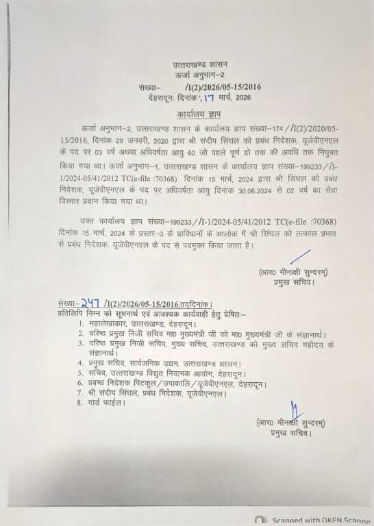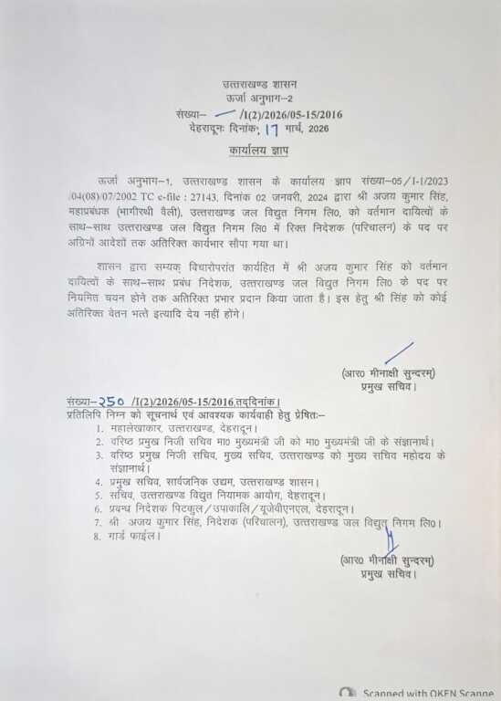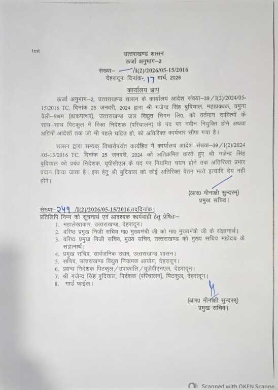 नए आदेशों के तहत यूपीसीएल में गजेन्द्र सिंह बुडियाल को अतिरिक्त प्रभार सौंपा गया है, जबकि यूजेवीएनएल की जिम्मेदारी अब अजय कुमार सिंह को दी गई है।
