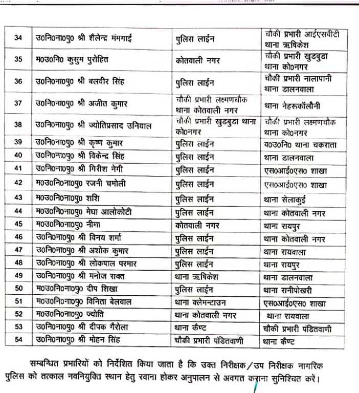 | 38 | ज्योतिप्रसाद उनियाल | चौकी प्रभारी खुड़बुड़ा (थाना कोतवाली नगर) | चौकी प्रभारी लक्ष्मणचौक (थाना कोतवाली नगर) |