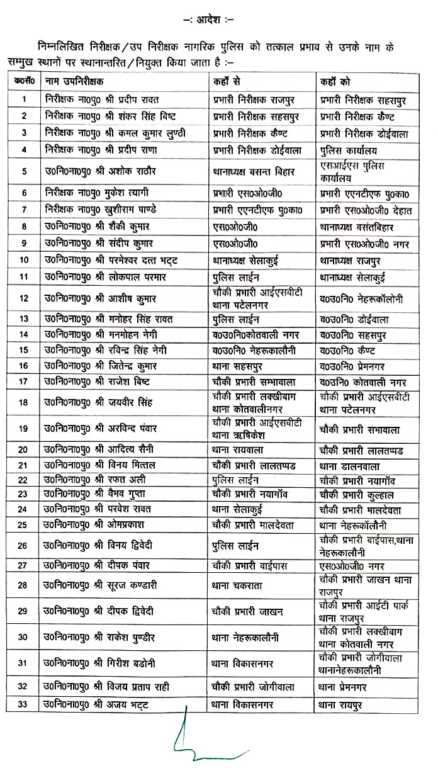 | 1 | प्रदीप रावत | प्रभारी निरीक्षक राजपुर | प्रभारी निरीक्षक सहसपुर |