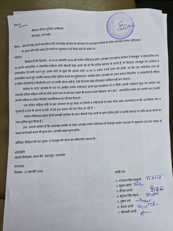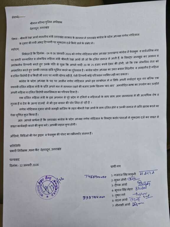 देहरादून, 13 जनवरी 2026: उत्तराखंड सरकार की लोकप्रिय मंत्री श्रीमती रेखा आर्या के खिलाफ उत्तराखंड कांग्रेस के प्रदेश अध्यक्ष गणेश गोदियाल द्वारा की गई अभद्र टिप्पणी पर BJP कार्यकर्ताओं ने वरिष्ठ पुलिस अधीक्षक (SSP) देहरादून को शिकायत सौंपी हैं। शिकायत में गोदियाल के खिलाफ कठोर धाराओं में मुकदमा दर्ज कर सख्त कार्रवाई की मांग की गई है।