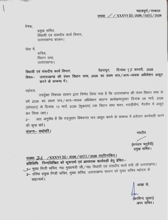 उत्तराखंड विधानसभा का बजट सत्र 9 से 13 मार्च तक गैरसैंण में आयोजित होगा। राज्यपाल का अभिभाषण 9 मार्च को होगा, जबकि 11 मार्च को वित्तीय वर्ष 2026-27 का बजट पेश किया जाएगा। यह सत्र राज्य के आगामी वित्तीय योजनाओं और महत्वपूर्ण निर्णयों पर केंद्रित रहेगा।