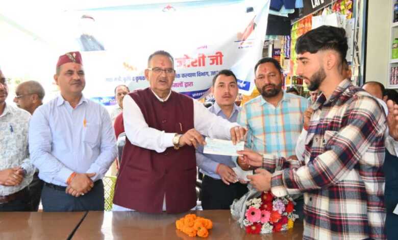 सहस्त्रधारा में आपदा प्रभावित दुकानदारों को सहायता राशि के चैक वितरित करते कैबिनेट मंत्री गणेश जोशी