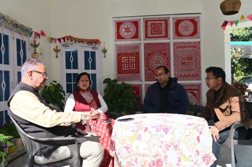 शासकीय आवास में मसूरी की पार्किंग व्यवस्था एवं वेंडर जोन निर्माण को लेकर बैठक करते कैबिनेट मंत्री गणेश जोशी