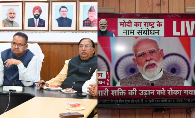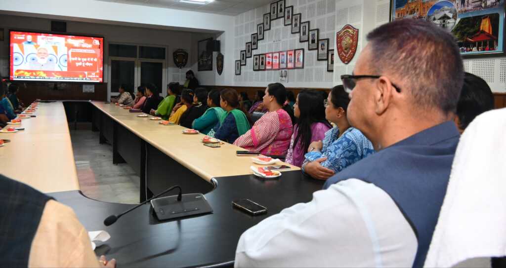 प्रधानमंत्री नरेंद्र मोदी के संबोधन को मातृशक्ति संग सुनते कैबिनेट मंत्री गणेश जोशी