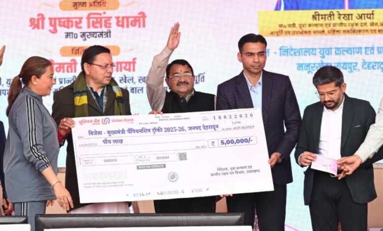 मुख्यमंत्री पुष्कर सिंह धामी ने बुधवार को ननूरखेड़ा, देहरादून में मुख्यमंत्री चैम्पियनशिप ट्रॉफी 2025-26 के समापन समारोह में प्रतिभाग किया। इस अवसर पर मुख्यमंत्री ने देहरादून जनपद को विजेता ट्रॉफी एवं 05 लाख रुपये का चेक प्रदान किया।