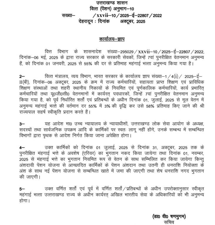 दीपावली से पहले मुख्यमंत्री पुष्कर सिंह धामी ने राज्य कर्मचारियों को बड़ी सौगात दी है। मुख्यमंत्री ने प्रदेश के सरकारी कर्मचारियों और पेंशनरों के लिए महंगाई भत्ते (DA) में 3 प्रतिशत की वृद्धि को मंजूरी दे दी है। अब कर्मचारियों को 55 प्रतिशत की जगह 58 प्रतिशत दर से महंगाई भत्ता मिलेगा।