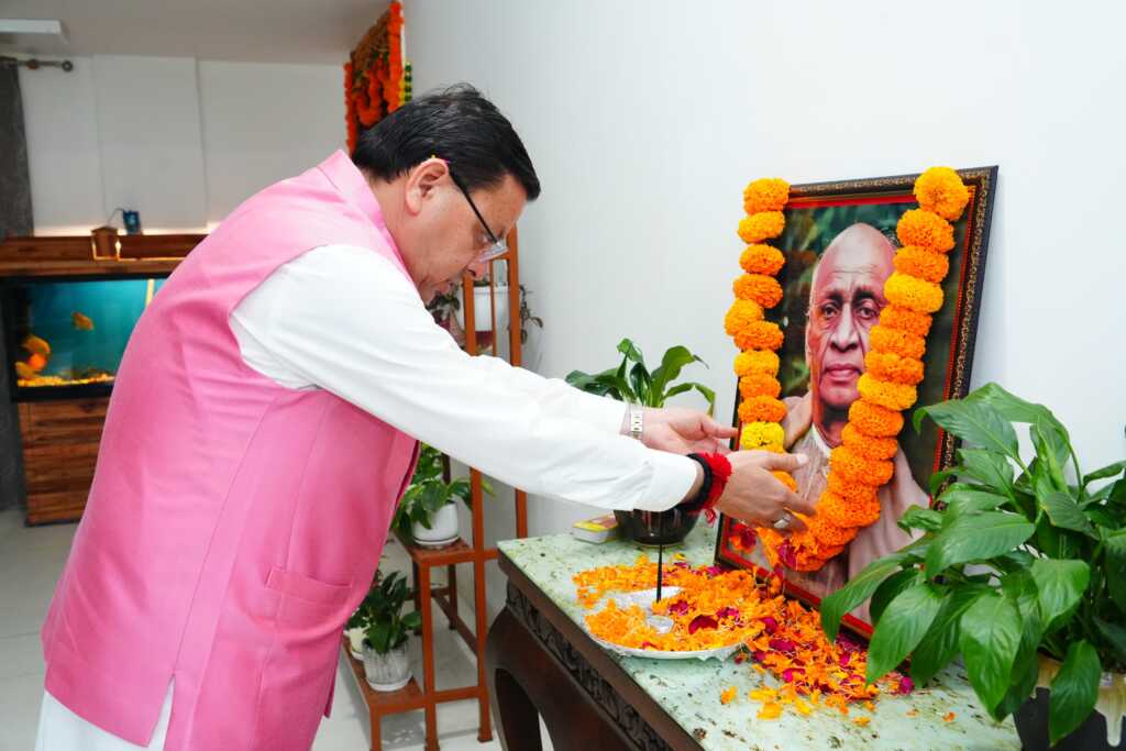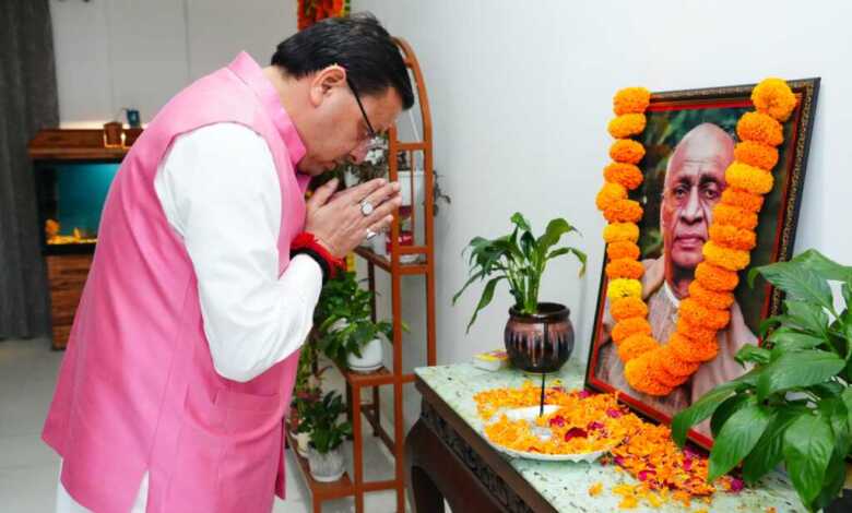 मुख्यमंत्री पुष्कर सिंह धामी ने शुक्रवार को लौह पुरूष सरदार बल्लभ भाई पटेल जी की जयन्ती के अवसर पर मुख्यमंत्री आवास में उनके चित्र पर श्रद्धा सुमन अर्पित कर श्रद्धांजलि दी ।