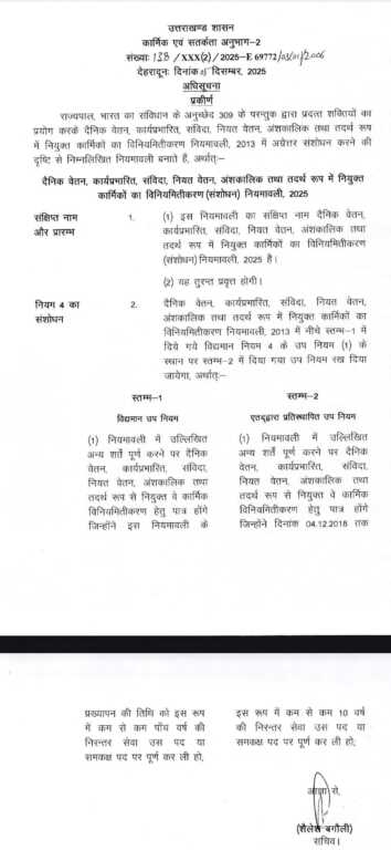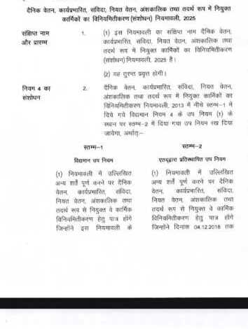 दैनिक वेतन, कार्यप्रभारित, संविदा, नियत वेतन, अंशकालिक तथा तदर्थ रूप में नियुक्त कार्मिकों का विनियमितीकरण (संशोधन) नियमावली-2025 जारी