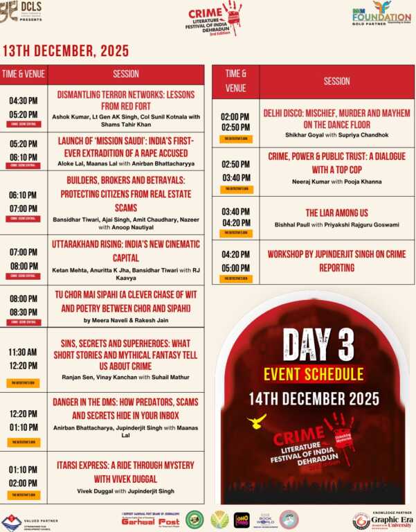11 दिसंबर 2025, देहरादून : दून कल्चरल एंड लिटरेरी सोसाइटी (डीसीएलएस) द्वारा आयोजित क्राइम लिटरेचर फेस्टिवल अपनी प्रतीक्षित तीसरी संस्करण के साथ 12 से 14 दिसंबर तक होटल हयात सेंट्रिक, देहरादून में आयोजित किया जा रहा है।