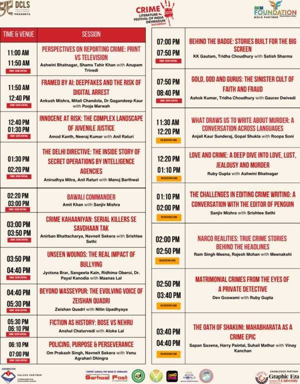 इसके साथ ही ज़ीशान कादरी, केके गौतम और त्रिधा चौधरी अपराध और सिनेमा के संबंध पर चर्चा करेंगे। अन्य सत्रों में डीप फेक, लैंड फ्रॉड, ड्रग्स, वीमेन सेफ्टी, साइबर फ्रॉड, सीरियल किलर, बुलिंग, और बहुभाषी अपराध साहित्य की वापसी पर विचार किया जाएगा।