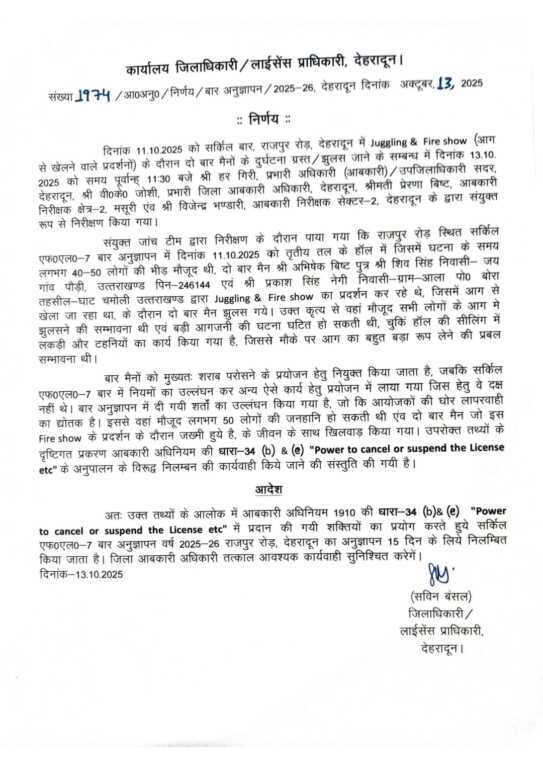 देहरादून दिनांक 14 अक्टूबर 2025 (सू वि), जिलाधिकारी सविन बंसल ने शहर के राजपुर रोड स्थित सर्किल बार में हुई आगजनी की घटना को गंभीरता से लेते हुए बार का लाइसेंस 15 दिन के लिए निलंबित कर दिया है।