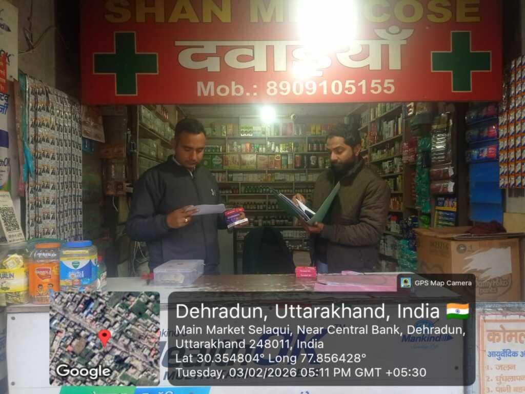 देहरादून, दिनांक 03 फरवरी 2026: अपर आयुक्त, खाद्य सुरक्षा एवं औषधि प्रशासन, उत्तराखंड श्री ताजबर सिंह जग्गी से प्राप्त निर्देशों के तहत “सेफ ड्रग, सेफ लाइफ अभियान” के अंतर्गत कोडीन युक्त कफ सिरप एवं अन्य psychotropic औषधीय की अवैध बिक्री की रोकथाम के लिए देहरादून में विशेष प्रवर्तन कार्यवाही की गई।