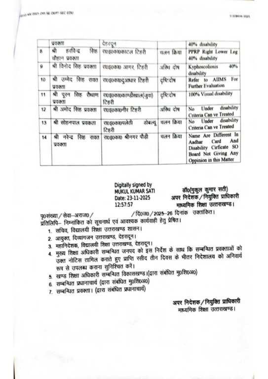 उत्तराखण्ड द्वारा दिव्यांगता से सम्बन्धित प्रमाण पत्रों का मूल्यांकन किया गया, जिसके क्रम में निम्नवत् सूची में अंकित प्रवक्ताओं को निर्देशित किया जाता है कि महानिदेशक चिकित्सा स्वास्थ्य एवं परिवार कल्याण,