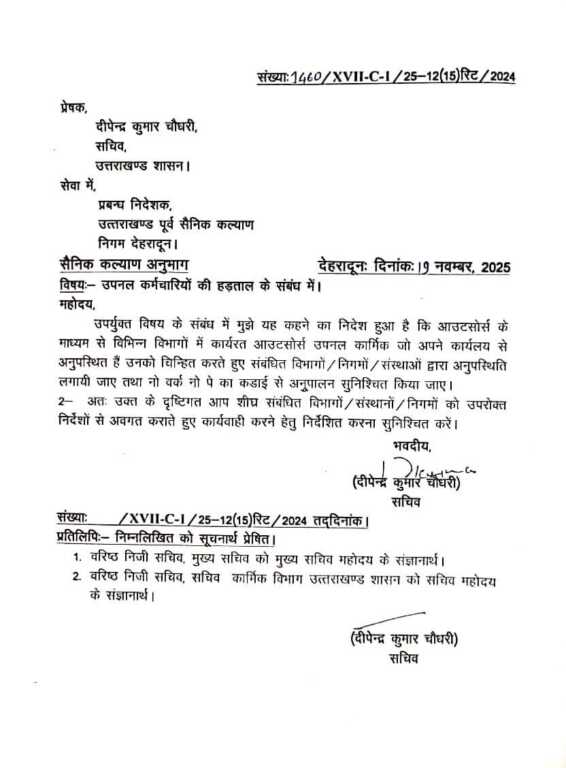 उपर्युक्त विषय के संबंध में मुझे यह कहने का निदेश हुआ है कि आउटसोर्स के माध्यम से विभिन्न विभागों में कार्यरत आउटसोर्स उपनल कार्मिक जो अपने कार्यलय से अनुपस्थित हैं उनको चिन्हित करते हुए संबंधित विभागों / निगमों / संस्थाओं द्वारा अनुपस्थिति लगायी जाए तथा नो वर्क नो पे का कडाई से अनुपालन सुनिश्चित किया जाए।