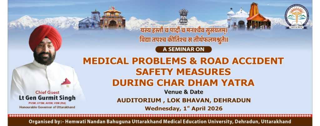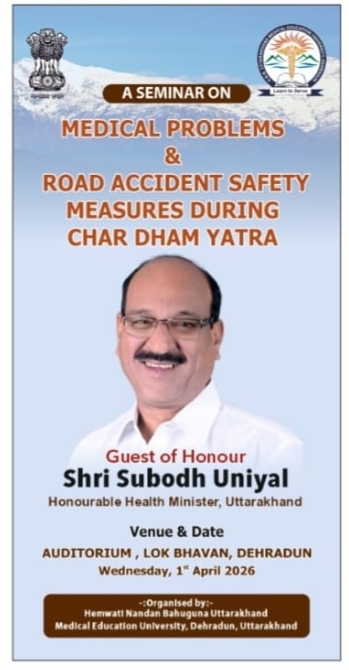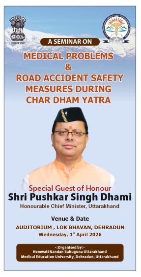 चारधाम यात्रा को सुरक्षित और व्यवस्थित बनाने की दिशा में कल बुधवार 1 अप्रैल को लोकभवन देहरादून में एक महत्वपूर्ण कार्यक्रम आयोजित किया जा रहा है। एचएनबी उत्तराखंड मेडिकल एजुकेशन यूनिवर्सिटी द्वारा “चारधाम यात्रा के दौरान मेडिकल समस्याएं एवं सड़क दुर्घटना सुरक्षा उपाय” विषय पर यह कार्यक्रम लोक भवन ऑडिटोरियम में सुबह 11 बजे से शुरू होगा।