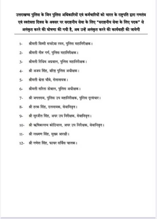 राज्यपाल ने उकृष्ट सेवाओं के लिए ‘राष्ट्रपति पुलिस पदक’ एवं ‘पुलिस पदक’ प्राप्त पुलिस अधिकारियों को सम्मानित किया। (सूची संलग्न)