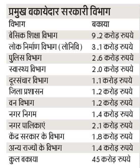 उत्तराखंड में सरकारी विभागों पर ऊर्जा निगम के 45 करोड़ रुपये से अधिक के बिजली बिल बकाया हैं। उत्तराखंड पहाड़ी महासभा की महासचिव गीता बिष्ट ने निगम के एमडी को पत्र लिखकर तत्काल वसूली की मांग की है।
