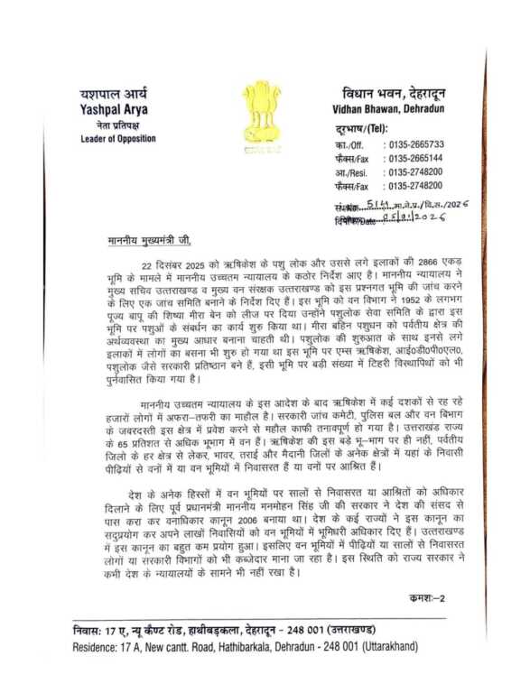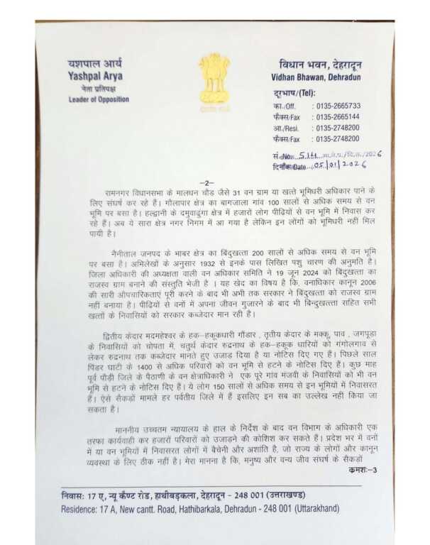 इसलिए मेरा आग्रह है कि कृपया वन भूमियों पर निवासरत राज्य भर के हजारों परिवारों के हित में अतिशीघ्र उत्तराखण्ड विधान सभा का विशेष सत्र आहूत करवाने का कष्ट करें।