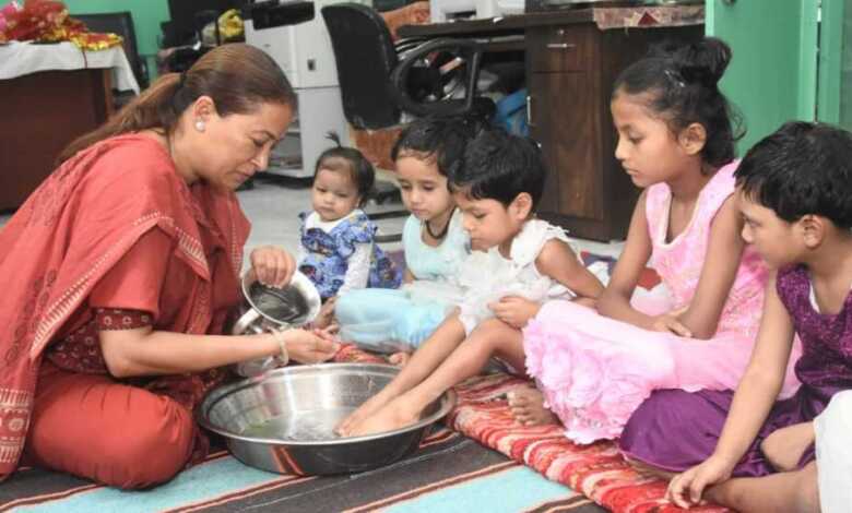 उन्होंने नन्हीं कन्याओं के चरण पखारकर उनका पूजन किया और उनके साथ बैठकर भोजन ग्रहण किया।