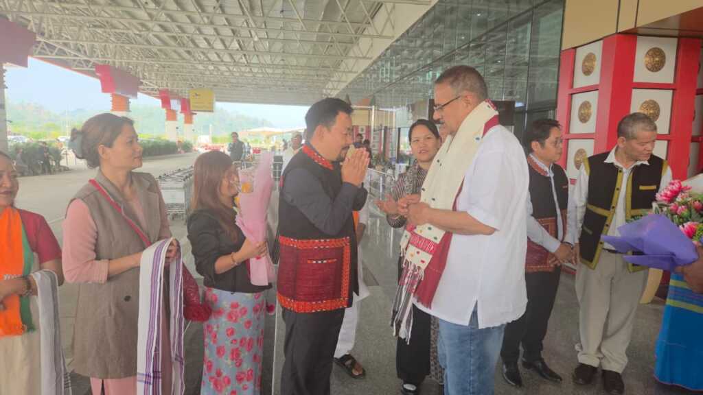 अरुणाचल प्रदेश आगमन पर ईटानगर एयरपोर्ट पर कृषि मंत्री गणेश जोशी का स्वागत करते पार्टी कार्यकर्तागण