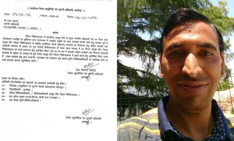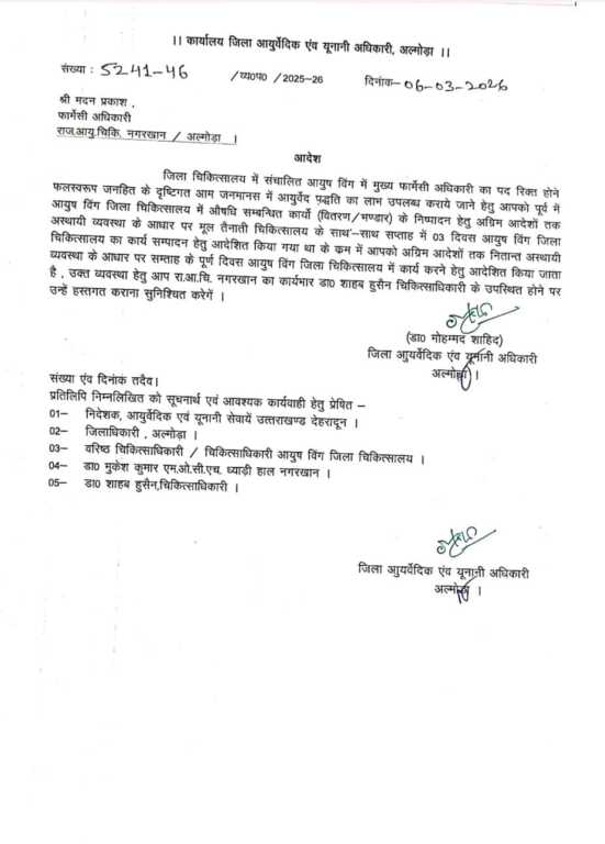 जारी आदेश के अनुसार मदन प्रकाश, जो वर्तमान में राजकीय आयुर्वेदिक चिकित्सालय नगरखान में तैनात हैं, अब सोमवार से शनिवार तक सप्ताह के छह दिन जिला चिकित्सालय के आयुष विंग में अपनी सेवाएं देंगे।