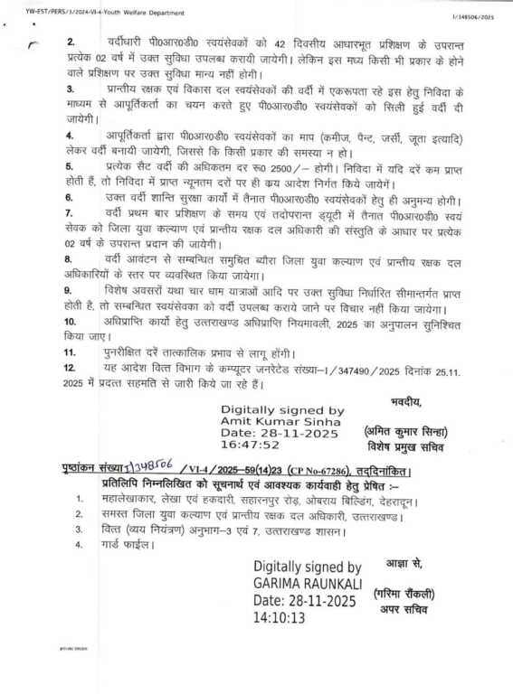 देहरादून, 28 नवंबर। प्रान्तीय रक्षक एवं विकास दल (पीआरडी) स्वयंसेवकों के लिए वर्दी भत्ते में वृद्धि की गयी है। अब वर्दी भत्ते के लिए हर 2 साल में ₹1500 के बजाय ₹2500 दिए जाएंगे। सर्दी और गर्मी के अलग-अलग यूनिफॉर्म सेट भी तय कर दिए गए हैं।