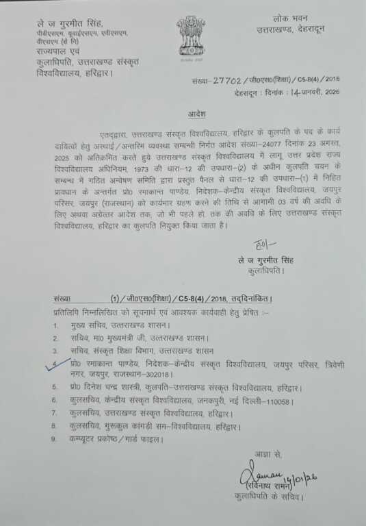 उन्हें कार्यभार ग्रहण करने की तिथि से आगामी तीन वर्षों की अवधि या अग्रिम आदेश तक, जो भी पहले हो उत्तराखंड संस्कृत विवि के कुलपति पद पर जिम्मेदारी दी गई है।