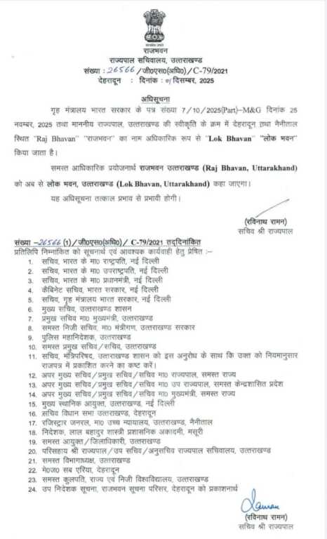देहरादून और नैनीताल में राजभवन को अब लोक भवन के नाम से जाना जाएगा।