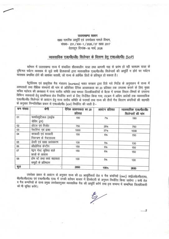 एसओपी के अनुसार राज्य में प्रतिदिन कुल 2650 व्यावसायिक एलपीजी सिलिडरों की आवश्यकता निर्धारित की गई है। इस आवश्यकता के आधार पर अलग-अलग क्षेत्रों को प्रतिशत के अनुसार आवंटन किया गया है।