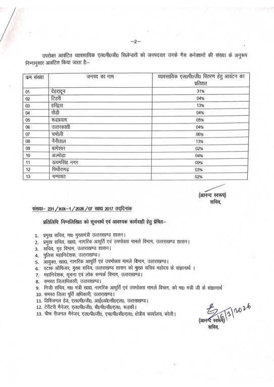 सरकार ने व्यावसायिक गैस सिलेंडरों का वितरण जिलों के गैस कनेक्शनों की संख्या के आधार पर तय किया है। आदेश के अनुसार जिलों को जरूरत के सापेक्ष निम्न प्रतिशत में गैस उपलब्ध कराई जाएगी।