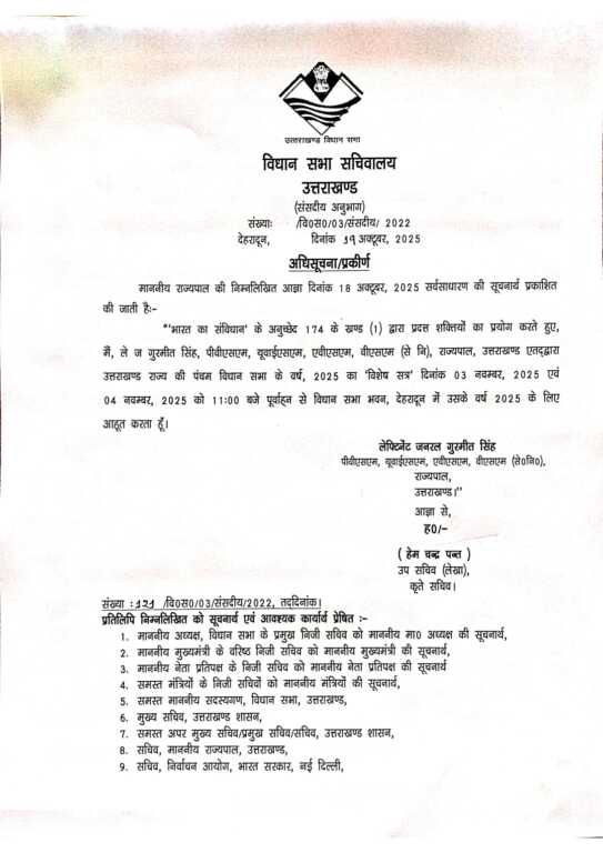 राज्यपाल ने भारत के संविधान के अनुच्छेद 174(1) के तहत प्रदत्त शक्तियों का प्रयोग करते हुए यह आदेश जारी किया है। अधिसूचना के अनुसार, विशेष सत्र का आयोजन 3 नवम्बर और 4 नवम्बर को प्रातः 11:00 बजे से देहरादून स्थित विधानसभा भवन में किया जाएगा।
