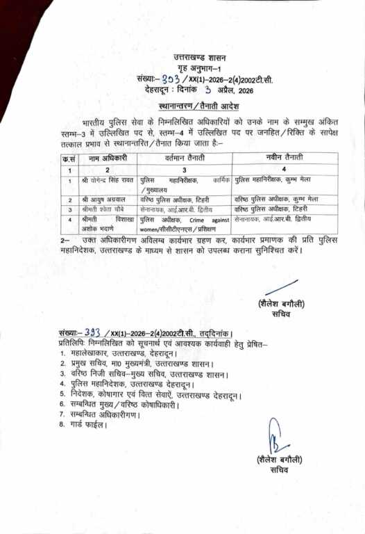 वहीं कुंभ मेला व्यवस्था को मजबूत करने के लिए योगेंद्र सिंह रावत को आईजी कुंभ की जिम्मेदारी दी गई है। रावत इससे पहले हरिद्वार में एसएसपी रह चुके हैं और कुंभ जैसे बड़े आयोजन का अनुभव भी रखते हैं, जिससे उनकी नियुक्ति को बेहद अहम माना जा रहा है।