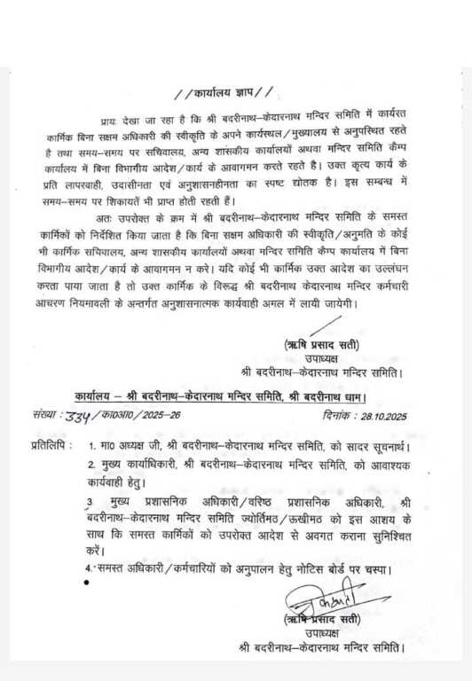 रावल की नाराजगी के बाद धाम में दर्शनों व पूजा के नाम पर हो रहे खेल और अव्यवस्थाओं को लेकर तमाम तरह की चर्चाएं हो रही हैं। हाल ही में बीकेटीसी के उपाध्यक्ष ऋषि प्रसाद सती द्वारा जारी कार्यालय ज्ञाप भी सोशल मीडिया पर वायरल हुआ,