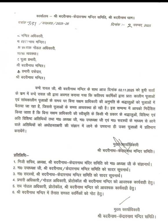जिसमें रावल के साथ हुई वार्ता का उल्लेख करते हुए कहा गया है कि मंदिर समिति के अध्यक्ष समेत किसी भी माध्यम से आने वाले अतिथियों को सीईओ के संज्ञान में लाने के बाद ही पूजाओं में बिठाया जाए।