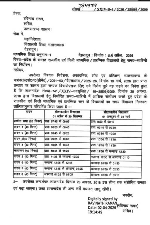जबकि सर्दियों में सुबह 8.50 बजे से 9.10 बजे तक प्रार्थना सभा होगी। जबकि छुट्टी 3.10 बजे होगी। शिक्षा सचिव ने कहा कि स्कूलों की समय सारणी में आंशिक संशोधन किया गया है। शासनादेश की अन्य शर्तें पहले की तरह लागू रहेंगी।