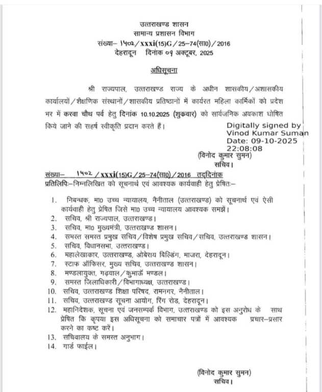 उत्तराखंड में करवा चौथ पर महिलाओं के लिए अवकाश घोषित कर दिया गया है। शुक्रवार 10 अक्टूबर को करवा चौथ है और महिलाएं छुट्टी का इंतजार कर रही थीं। देहरादून की बात करें तो बाजार सके हुए हैं और मुख्य बाजारों से लेकर गली मोहल्लों में जगह जगह मेहंदी लगाई जा रही है। दुकानें रंगीन लड़ियों से सजी हैं। इसके साथ ही पूजन सामग्री और मिठाई की दुकानों में भी रौनक है। हालांकि, दी भर महिलाएं इस संशय में रही कि कल सरकारी छुट्टी है या नहीं। आखिरकार देर रात उत्तराखंड शासन ने महिलाओं के लिए अवकाश की घोषणा कर दी।