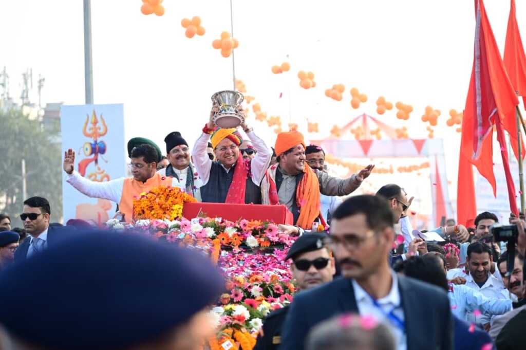 इससे पूर्व माननीय मुख्यमंत्री धामी ने त्रिशूल चौक का लोकार्पण किया उससे पूर्व उन्होंने कांवरियों की पैर पखारे एवं उनको अंगवस्त्र व पुष्प माला भेंट कर उनका अभिवादन किया, इसके उपरांत त्रिशूल चौक से सरस मेला कार्यक्रम स्थल गांधी पार्क तक आयोजित शिव बारात में प्रतिभाग किया। शिव बारात में माननीय मुख्यमंत्री का विभिन्न संगठनों व जनता द्वारा फूलमाला,पुष्पवर्षा कर भव्य स्वागत किया।