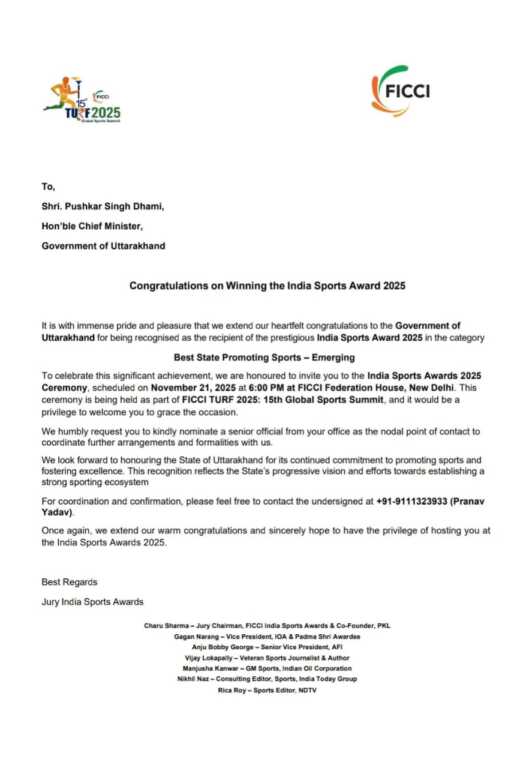उत्तराखंड को “FICCI द्वारा आयोजित ‘इंडिया स्पोर्ट्स अवार्ड 2025’ में सर्वश्रेष्ठ उभरता राज्य का खिताब