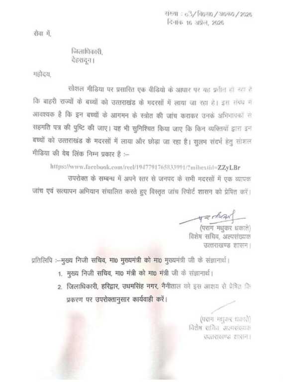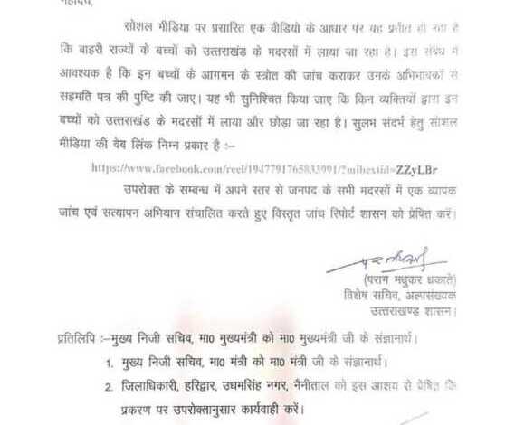 उत्तराखंड शासन के संज्ञान में सोशल मीडिया पर प्रसारित एक वीडियो आया है, जिसमें यह संकेत मिलता है कि बाहरी राज्यों के बच्चों को राज्य के मदरसों में लाया जा रहा है। इस विषय को गंभीरता से लेते हुए शासन ने आवश्यक जांच के निर्देश जारी किए हैं।
