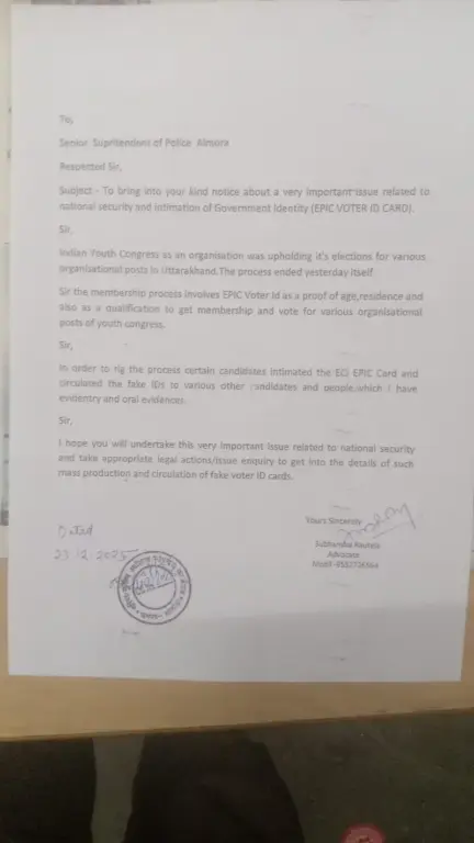 अल्मोड़ा से जिला अध्यक्ष पद के प्रत्याशी शुभांशु रौतेला ने चुनावी प्रक्रिया पर सवाल उठाते हुए बड़े पैमाने पर धांधली का आरोप लगाया है। शुभांशु का दावा है कि न केवल वोटों की गिनती में गड़बड़ी हुई है, बल्कि वोटर आईडी (EPIC) के साथ भी छेड़छाड़ की गई है। उन्होंने इस संबंध में पहले ही एसएसपी अल्मोड़ा को एक शिकायत पत्र सौंप दिया था।