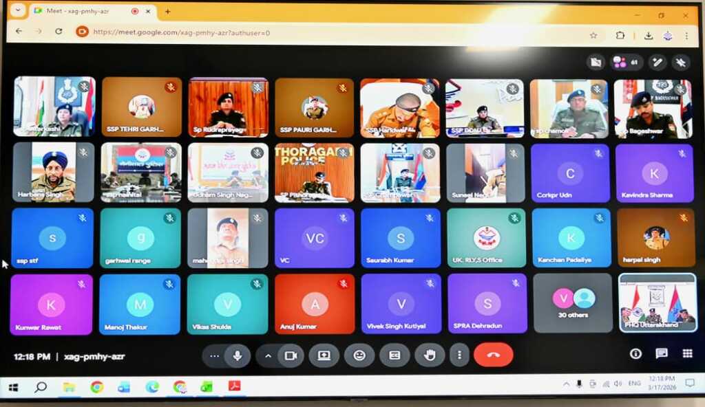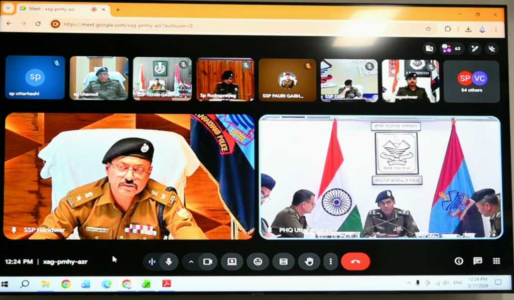 आज डॉ0 वी0 मुरूगेशन, अपर पुलिस महानिदेशक, अपराध एवं कानून व्यवस्था, उत्तराखण्ड द्वारा IG गढ़वाल /कुमाऊं रेंज, समस्त जनपद प्रभारियों सहित समस्त अपर पुलिस अधीक्षक/क्षेत्राधिकारियों के साथ वीडियो कॉन्फ्रेन्सिंग के माध्यम से भूमि सम्बन्धी धोखाधड़ी के अभियोगों, प्रचलित सत्यापन सम्बन्धी अभियान, गुमशुदाओं की बरामदगी तथा लम्बित विवेचनाओं की समीक्षा की गयी।